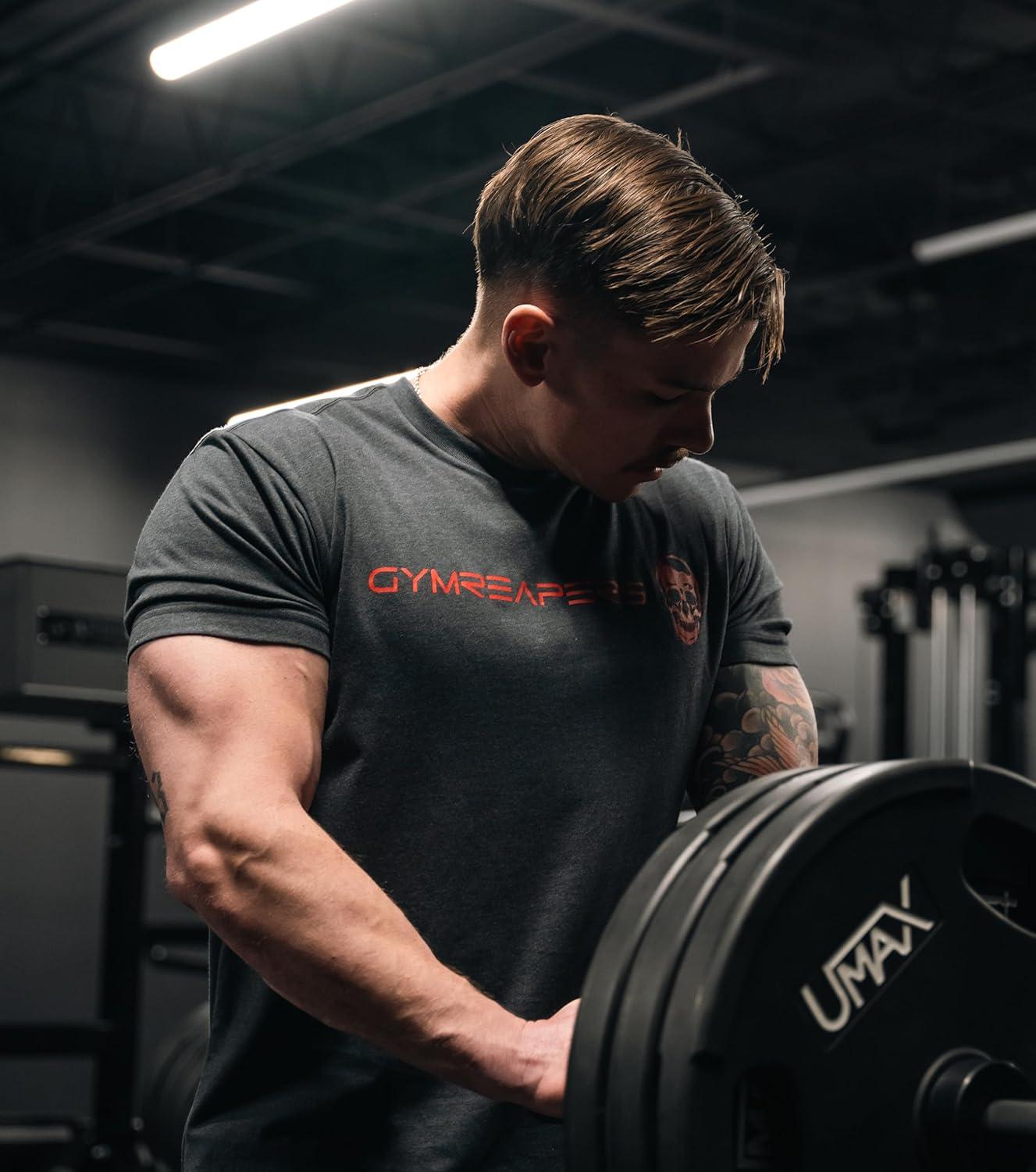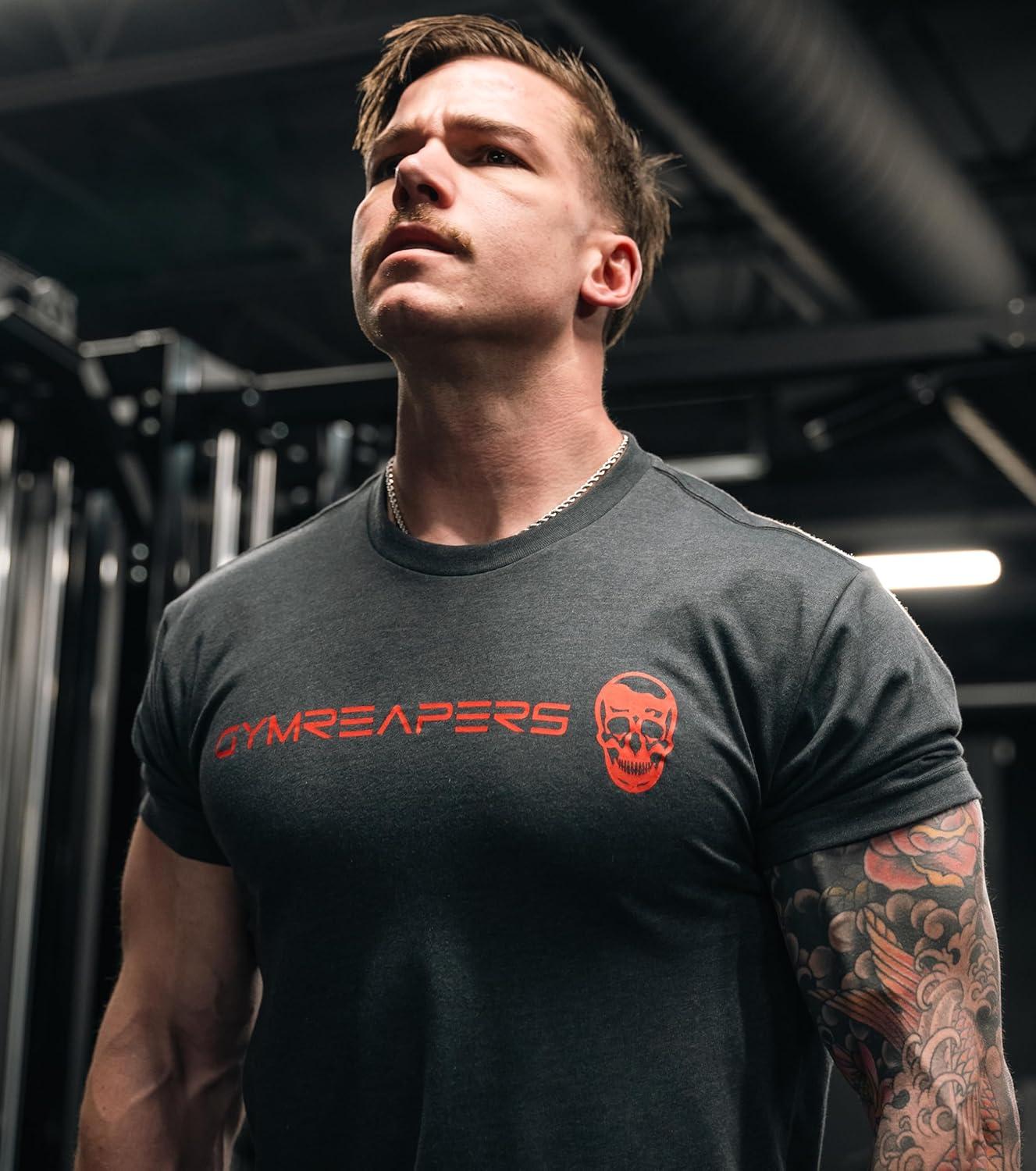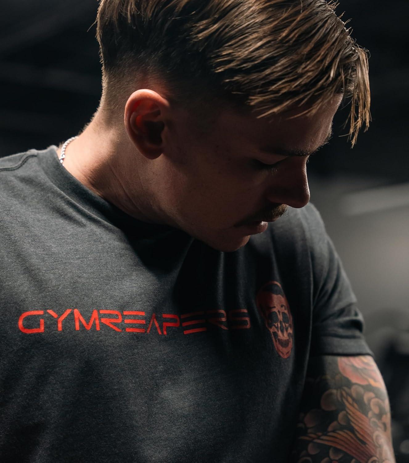 Gymreapers Moisture Wicking Short Sleeve T-Shirt for Men – Crew Neck Workout Shirts – Casual Gym Cotton Everyday Tee(Charcoal/Red)