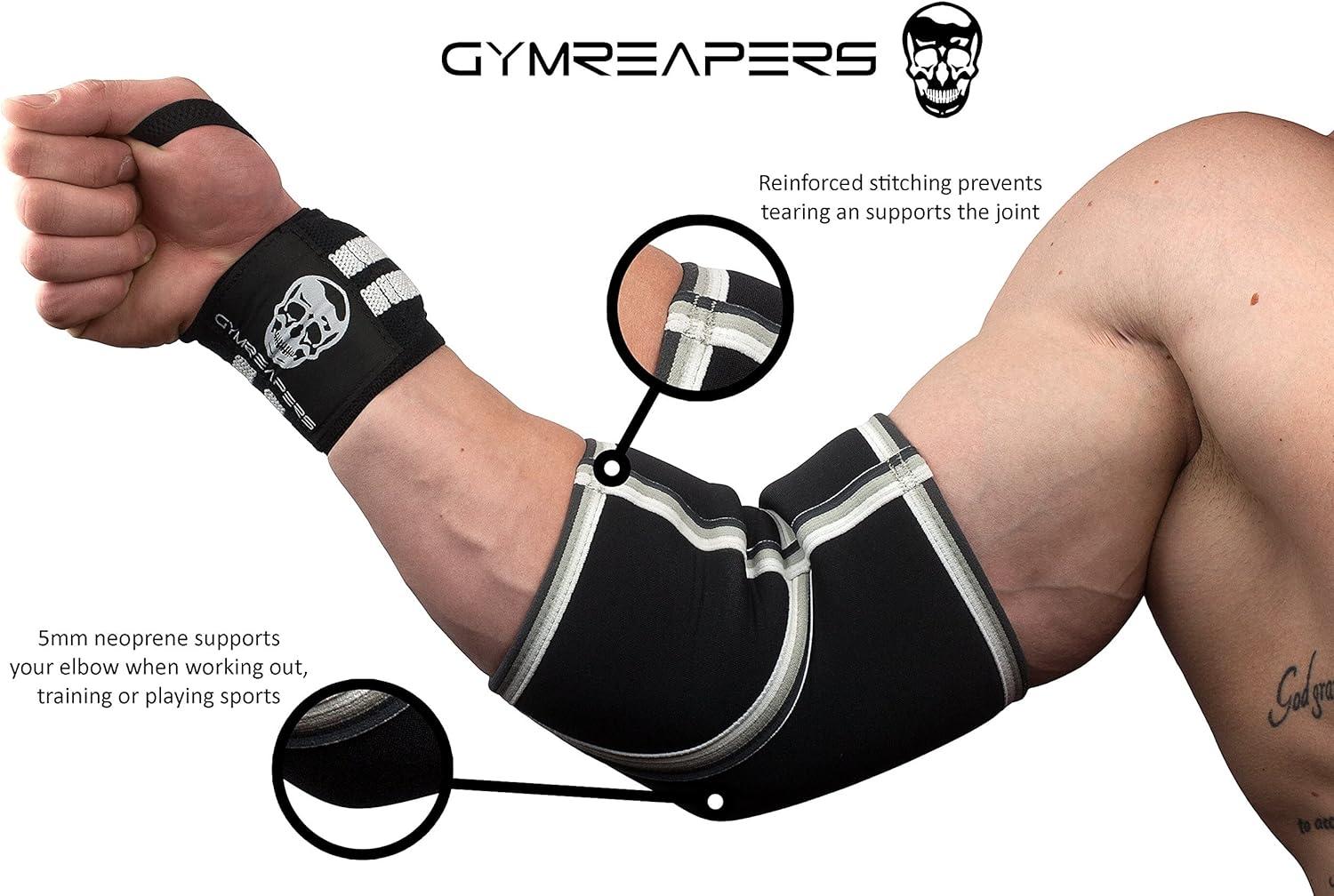 Gymreapers Elbow Sleeves for Weightlifting Powerlifting and Bench Press Support and Compression for Tendonitis Pain Relief 5mm Neoprene Training Gear for Men and Women(Black/White)